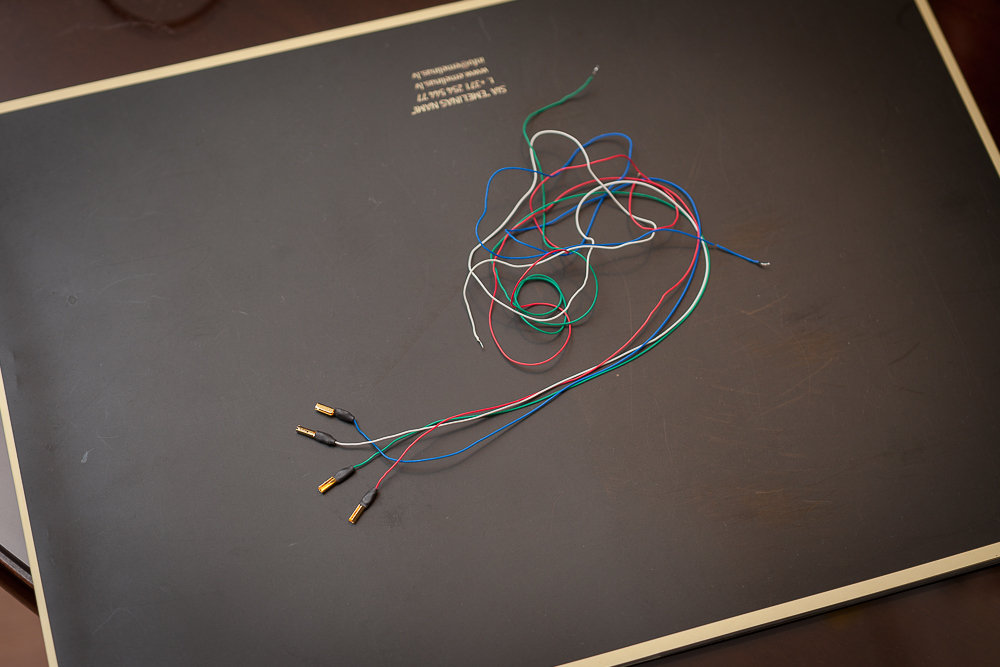 Šāds bija tonarma oriģinālais kabelis, pielodēts pie spailēm atskaņotāja iekšienē.
